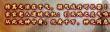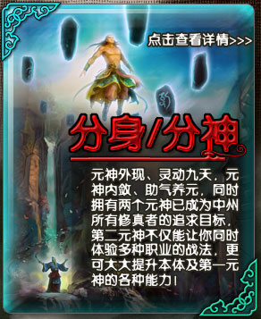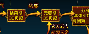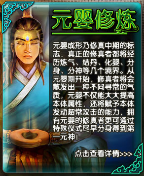 元婴修炼第一阶段,可开启元气,获得新技能“真元决”。 元婴修炼第二阶段,聚气为丹,可得到内丹 化丹为婴,元婴出世